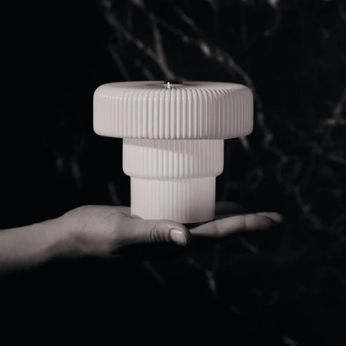 Legg til et mykt skjær i rommet med Ripple bærbar lampe. Laget av munnblåst glass med en bølget overflate og hvit opalfinish, gir den et varmt, diffust lys.