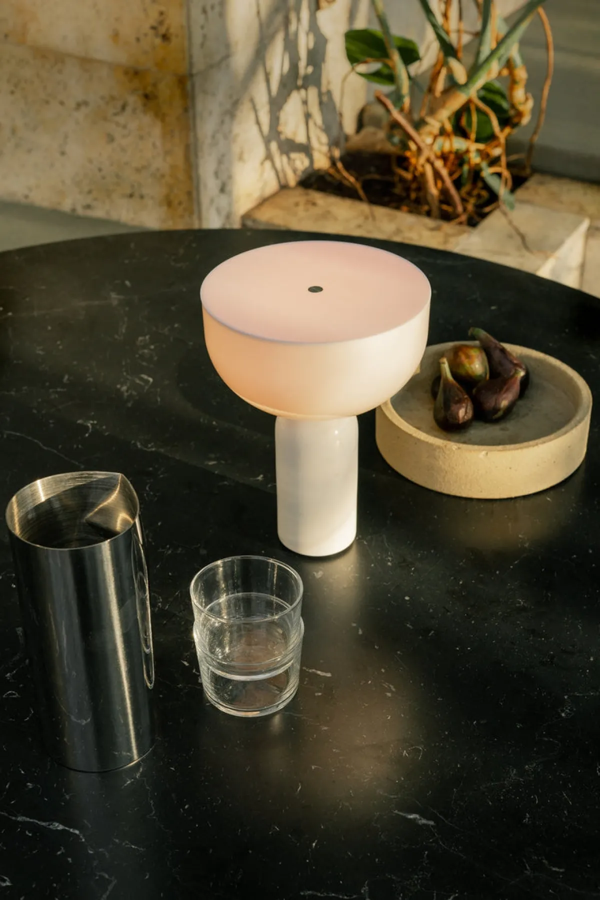 Ettersom lyset sprer seg fra hele den øvre delen av lampen, gir den lille bordlampen et høyt lysutbytte. En dreid forsenket metallsirkel på toppen av lampen tilfører en raffinert detalj til designet, og ved å banke forsiktig på sirkelen kan lyset dimmes til tre ulike nivåer. Den bærbare Kizu-bordlampen har en batterilevetid på 10 timer ved en lysinnstilling på 100 % og lades med en USB-C-kabel.
