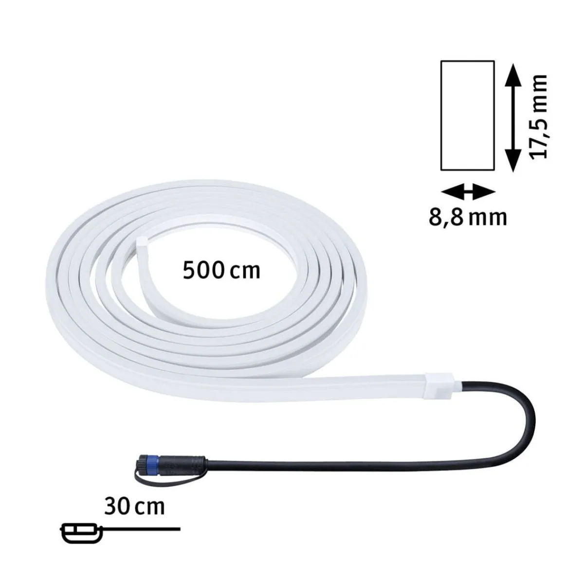 Den 5 meter lange Plug & Shine Smooth Strip i 3000K er fullstendig værbestandig og kan kobles direkte til enden av 24V-systemet. Resultatet er en lyslinje uten synlige LED-lyspunkter som kan monteres fleksibelt. Derfor er det et godt valg for å belyse hagestier, blomsterbed eller kanter. Vi anbefaler å bruke monteringsklipsene eller aluminiumsskinnen for optimal feste. Medfølger ikke og kan kjøpes som tilbehør.