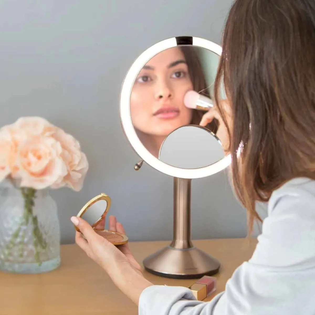 Sminkespeil med LED-belysning som lyser opp med naturlig belysning når et ansikt nærmer seg.