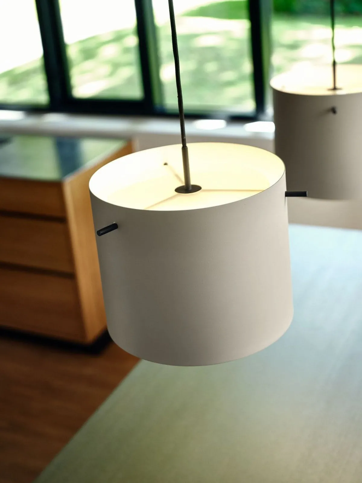 FM1954 Pendel er tilgjengelig i tre størrelser og tre farger – svart, hvit og grå/sand struktur. Leveres med en sort stoffledning og svart baldakin.