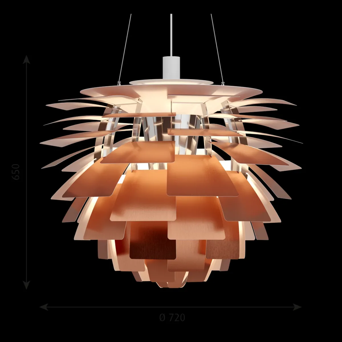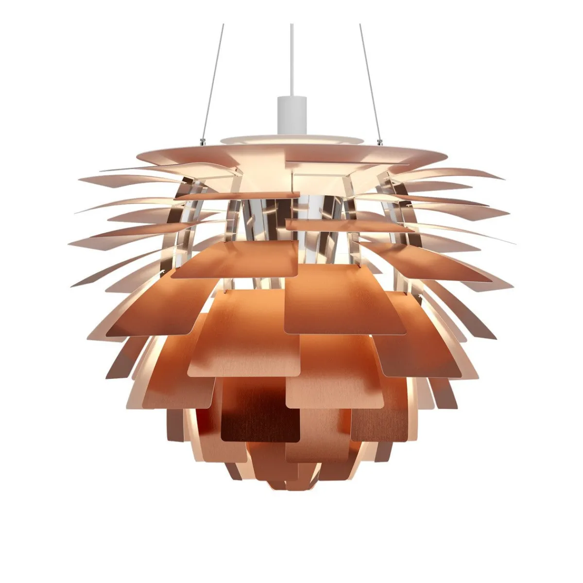 PH Artichoke pendel fra Louis Poulsen lyser opp ethvert rom med 100 % blendefritt lys, takket være de 72 bladene, som danner 12 presist plasserte rader med seks blader hver. Armaturen sørger for at lyset fordeles innover og utover, og dermed avgir den et vakkert og behagelig lys. Videre opprettholdes den høye kvaliteten på lyset i den energieffektive LED-utgaven, som skaper den samme berømte atmosfæren rundt pendelen.