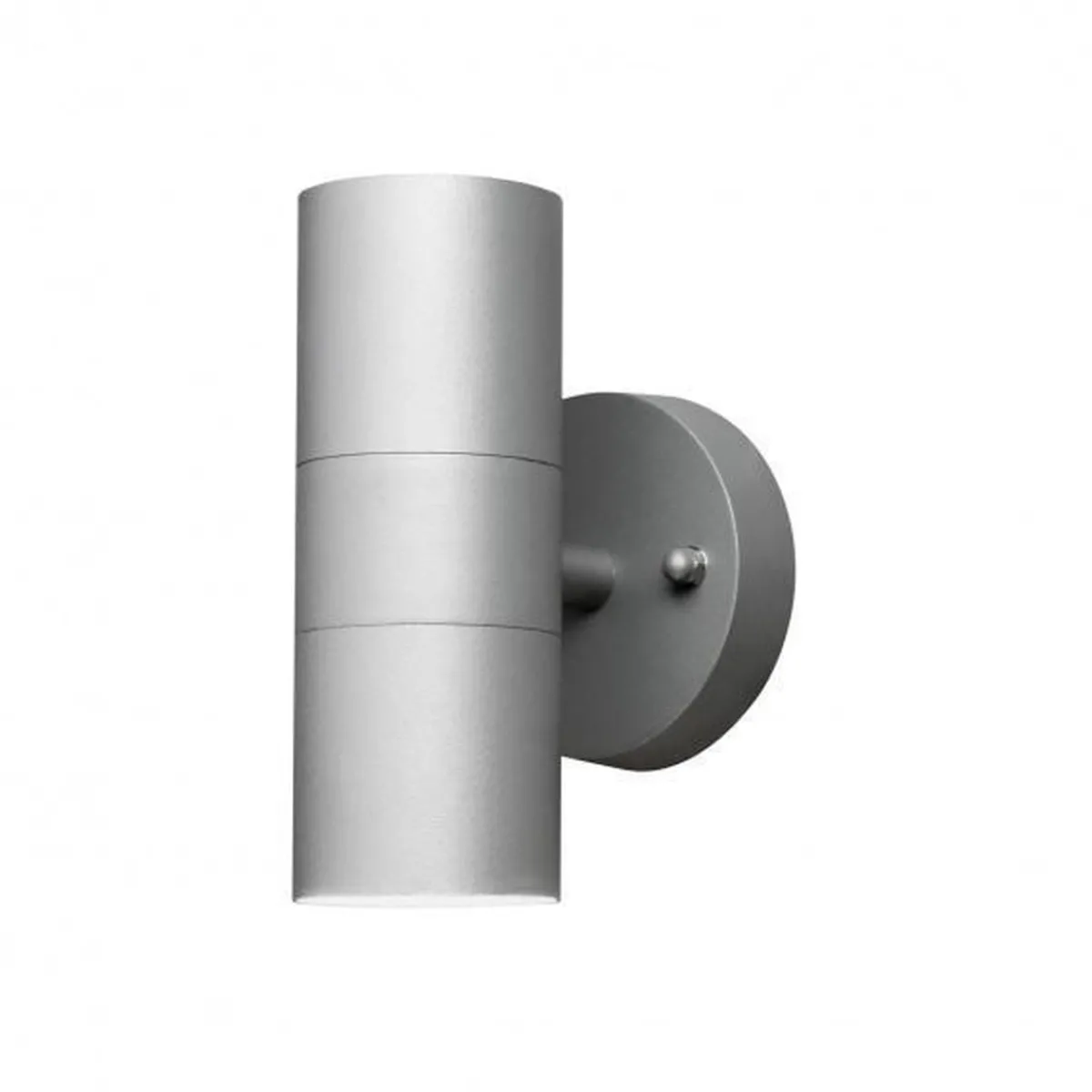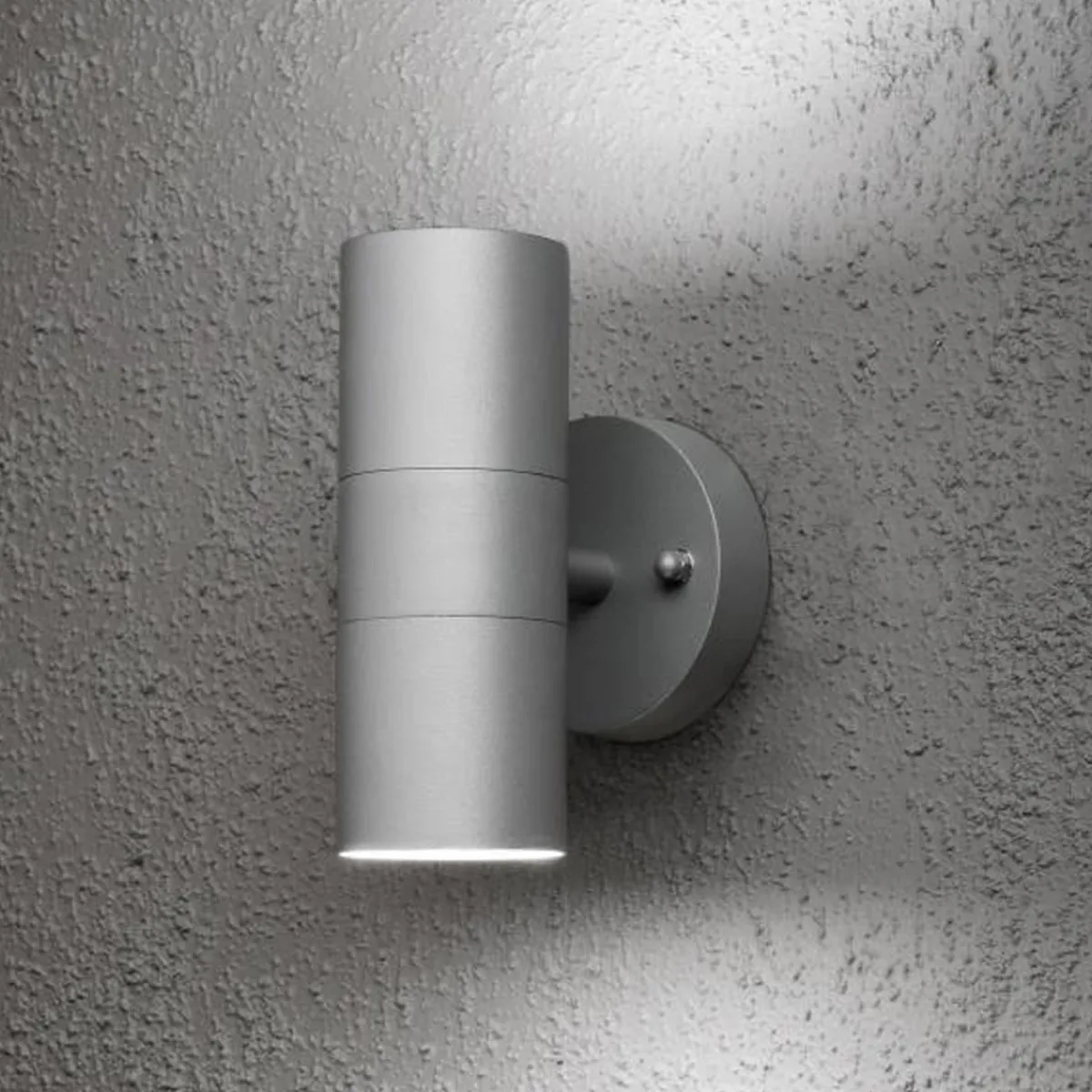 Moderne grå vegglampe som lyser opp og ned på veggen. Utelyset er en del av en lampe-serie.
