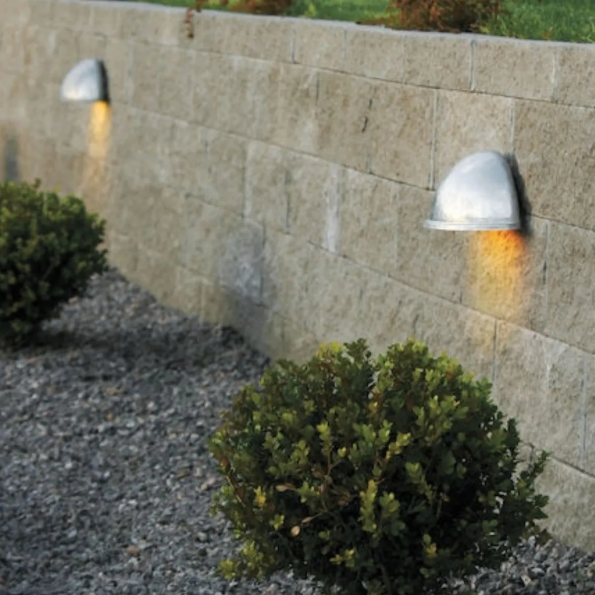 Stor galvanisert vegglampe som er utformet som en halvmåne til utendørs bruk.