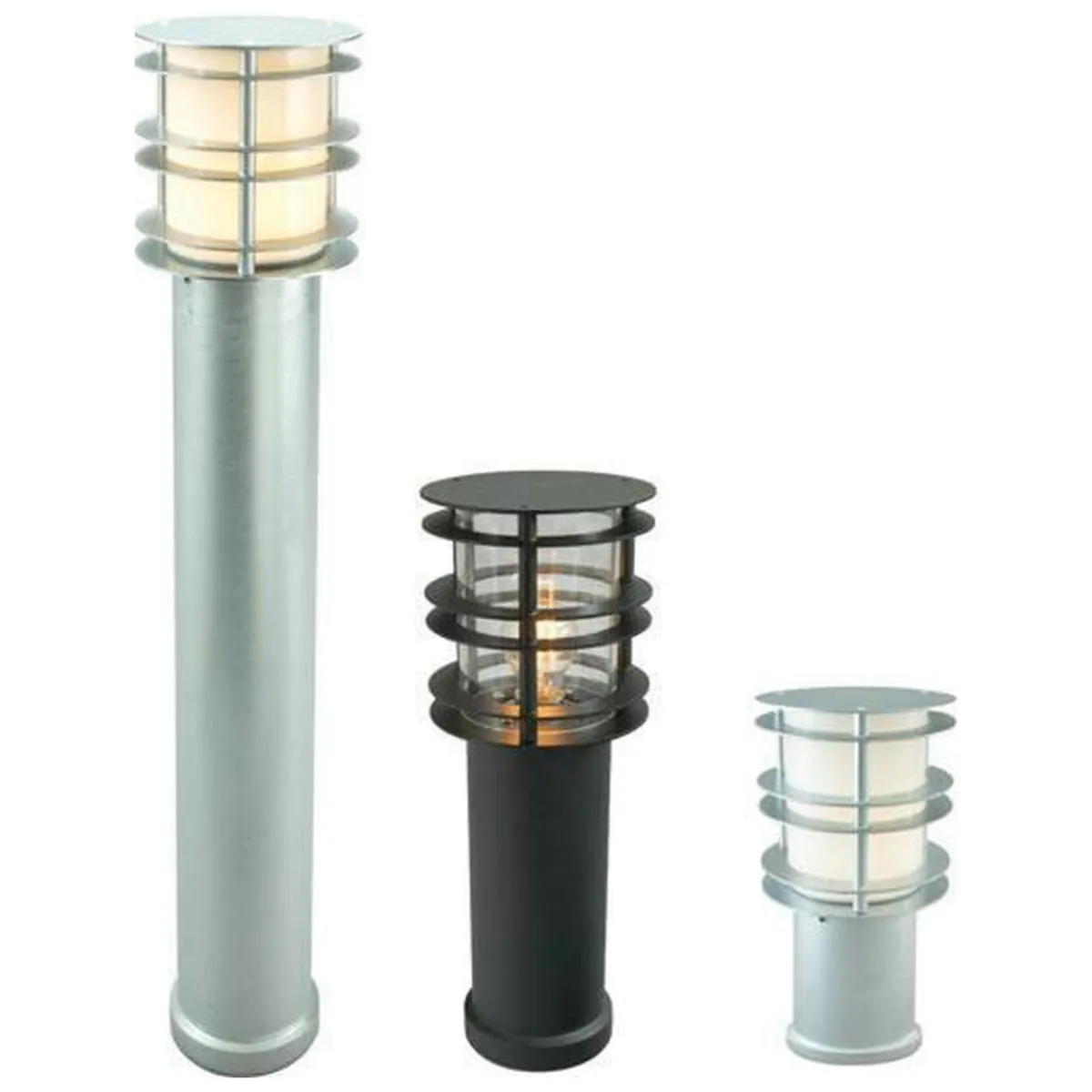 Pullert i moderne design med opalhvitt glass i polykarbonat. Lampen finnes i tre ulike høyder og i fargene galvanisert stål og sort. Lampen er en del av en serie som inneholder vegglamper i to ulike størrelser, portstolper i to ulike størrelser, blomsterstolpe, teleskopstolper med 1 til 3 lyktehoder, samt pullerter i to ulike høyder. Alle utgaver leveres med klar e polykarbonat deksel.