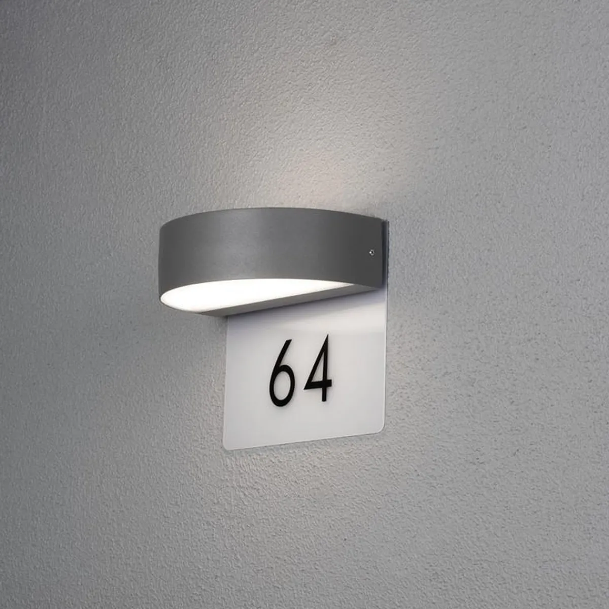 Enkel og pen vegglampe inkludert husnummer 0-9 x 3. Lampen kan fint brukes uten husnummer.