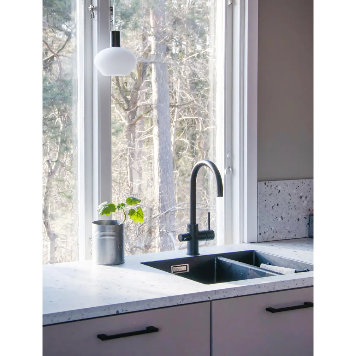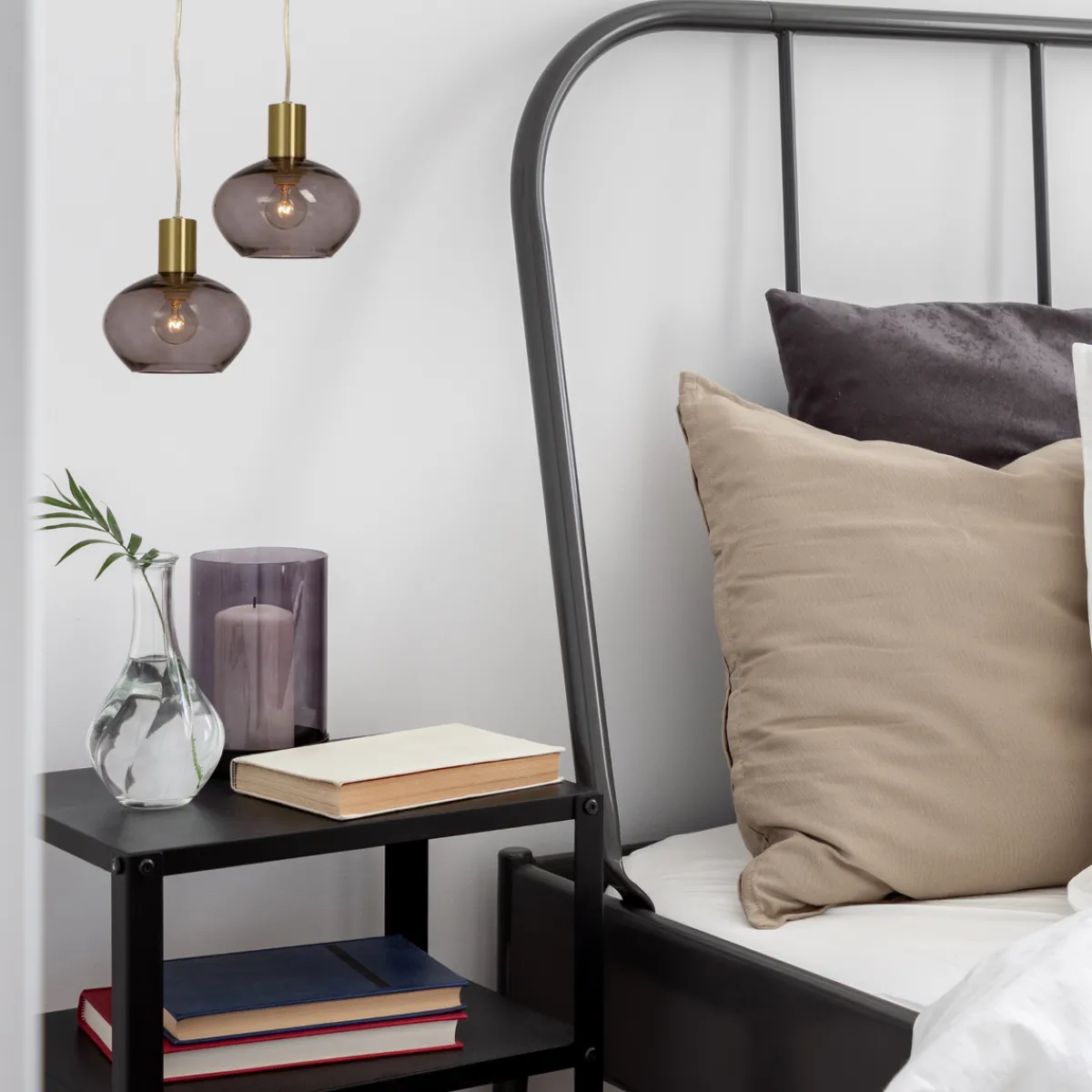 Bell vinduspendel i svart med glasspendel i fargen røk. Lampens hovedmateriale er metall/glass. Lyset tennes og slukkes med bryter på ledning. Ledning 4 meter. Maks wattstyrke 30W. Lampe monteres med brakett på ledning og strømtilkobling med støpsel.